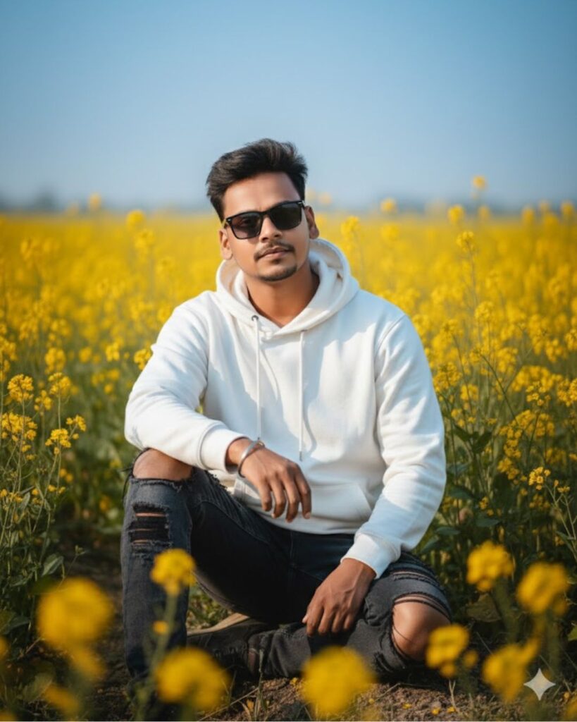 A 25-year-old stylish Indian man standing confidently in the middle of a vast mustard field filled with bright yellow flowers. He is posing with confidence, one hand in his pocket and a slight smile on his face. He is wearing a dark-colored hoodie (black or dark green) paired with fitted blue jeans. His hair is neatly styled and gently flowing in the breeze. The background shows endless mustard fields under soft sunlight with a warm golden glow. Cinematic depth of field, ultra-realistic look, 8K resolution, DSLR photography style, sharp focus, natural skin tone, high contrast, professional color grading, shallow depth of field, bokeh effect, fashion photoshoot vibe, realistic shadows, high-quality portrait.